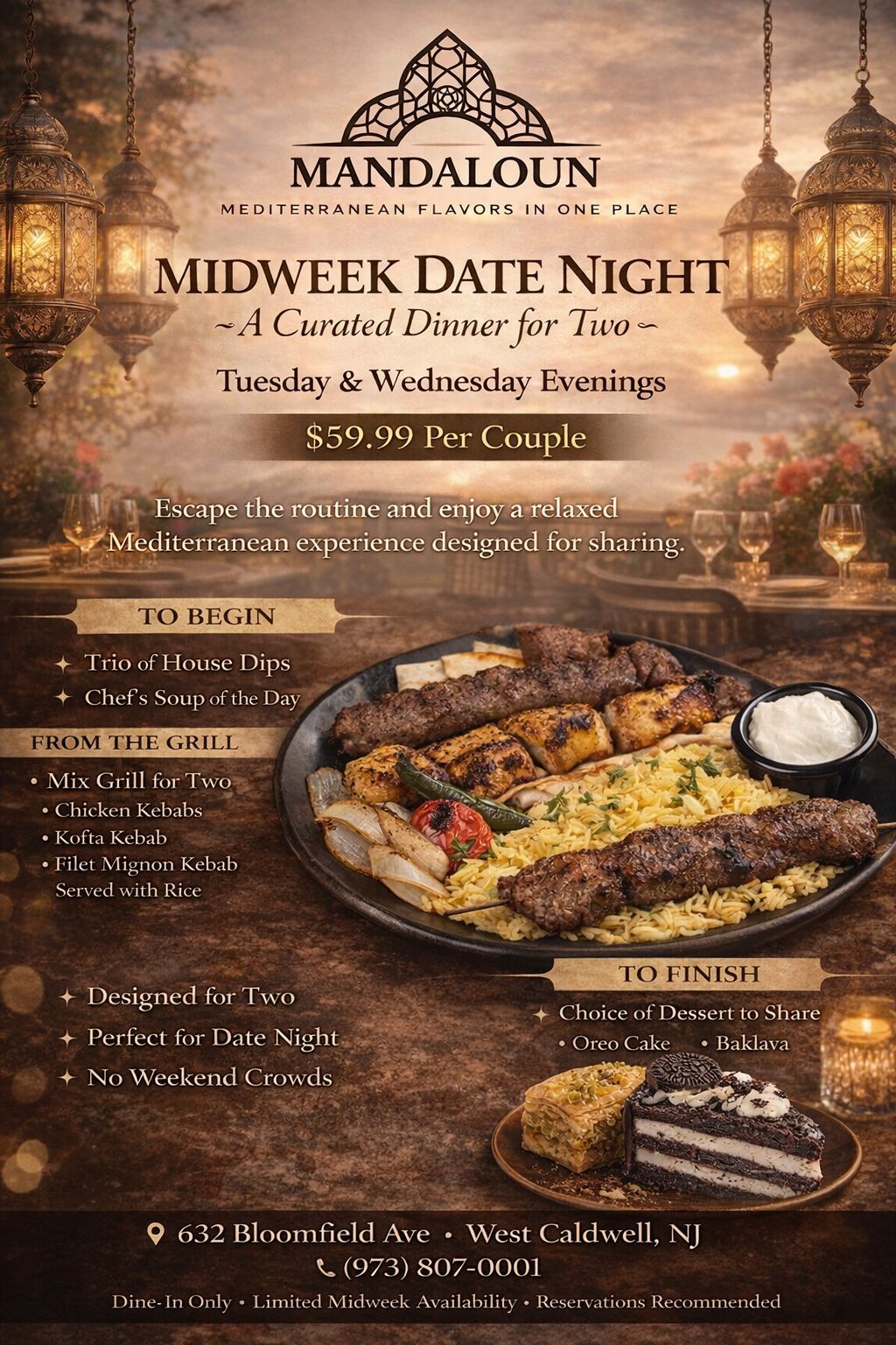At Mandaloun Mediterranean Cuisine, we invite you to embark on a culinary adventure that beautifully combines the rich traditions of Lebanese and Syrian cuisine with a delightful American twist. Located in the heart of West Caldwell, NJ. Our restaurant is dedicated to providing an unforgettable dining experience that caters to all taste buds, whether you're a fan of bold spices or prefer milder flavors.